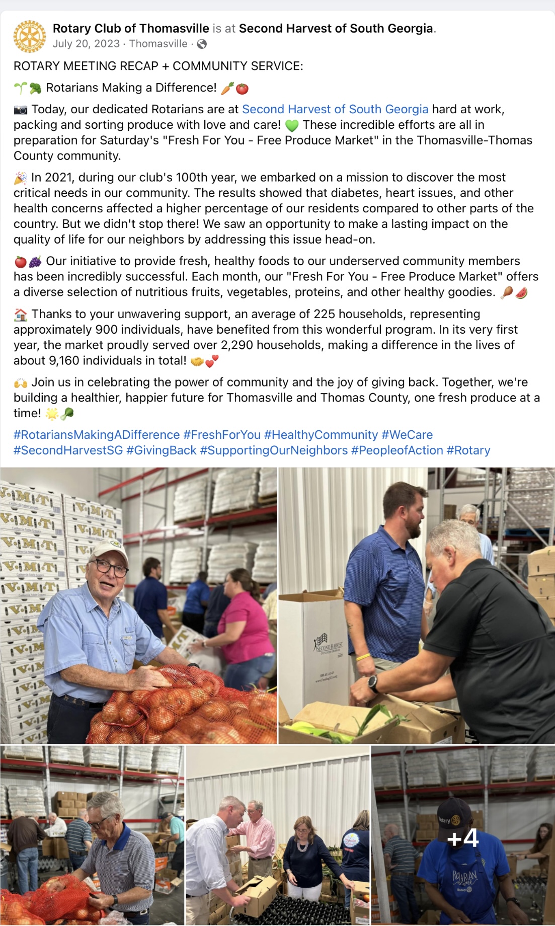 Snippet of Facebook post recapping Rotarians packing and sorting fruit and vegetables at Second Harvest of South Georgia in preparation for July 2023 fresh produce market.
