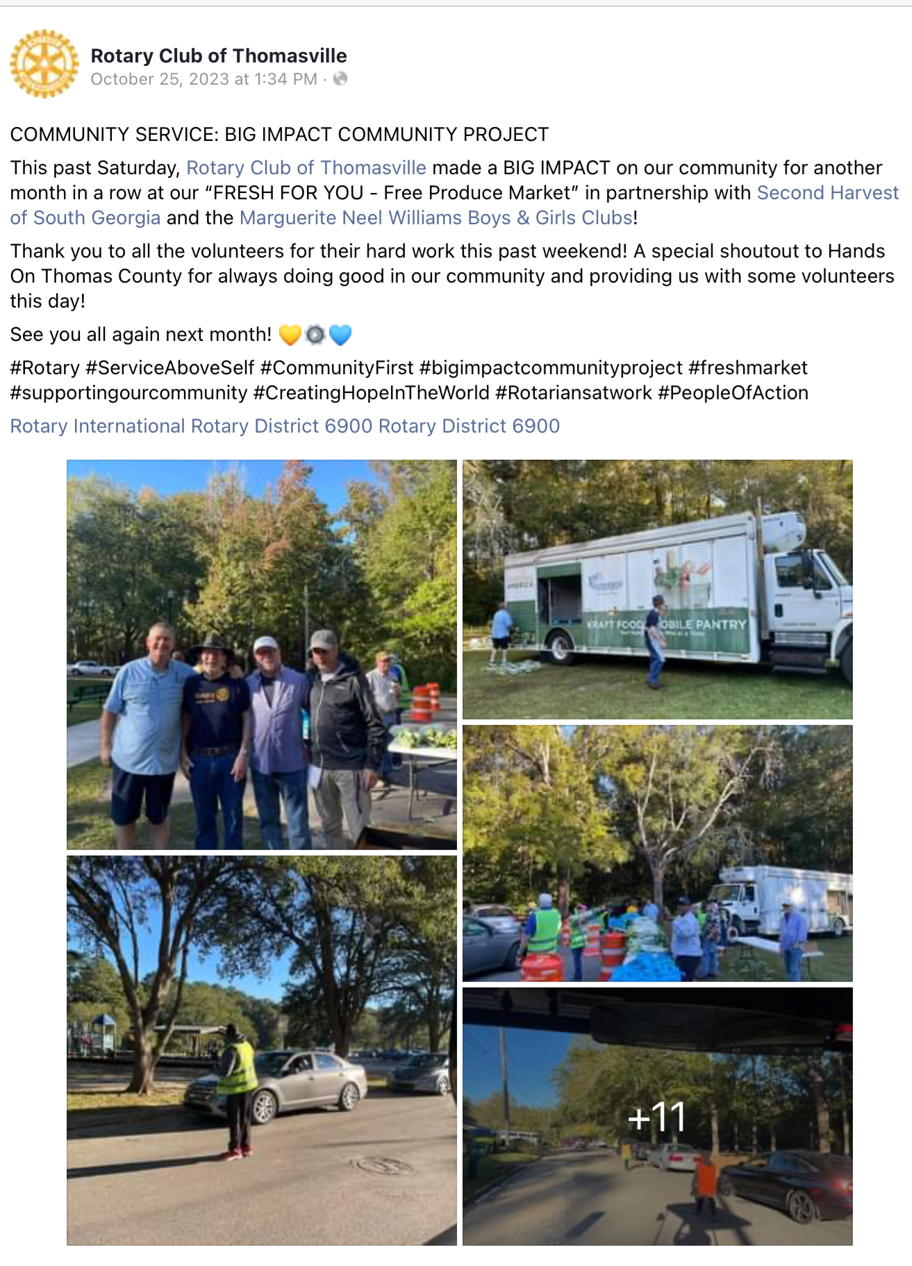 Snippet of Facebook post recapping Rotarians packing and sorting fruit and vegetables at Second Harvest of South Georgia in preparation for October 2023 fresh produce market.