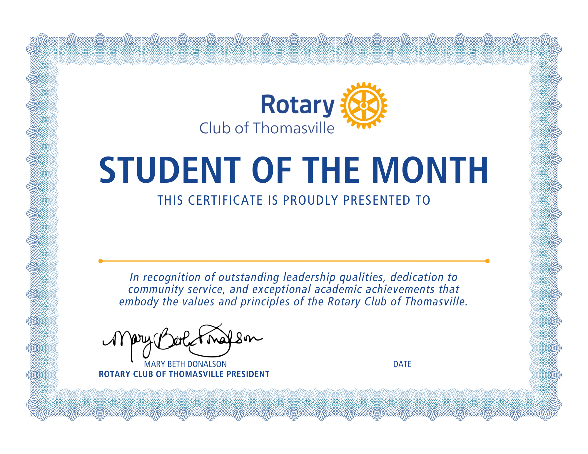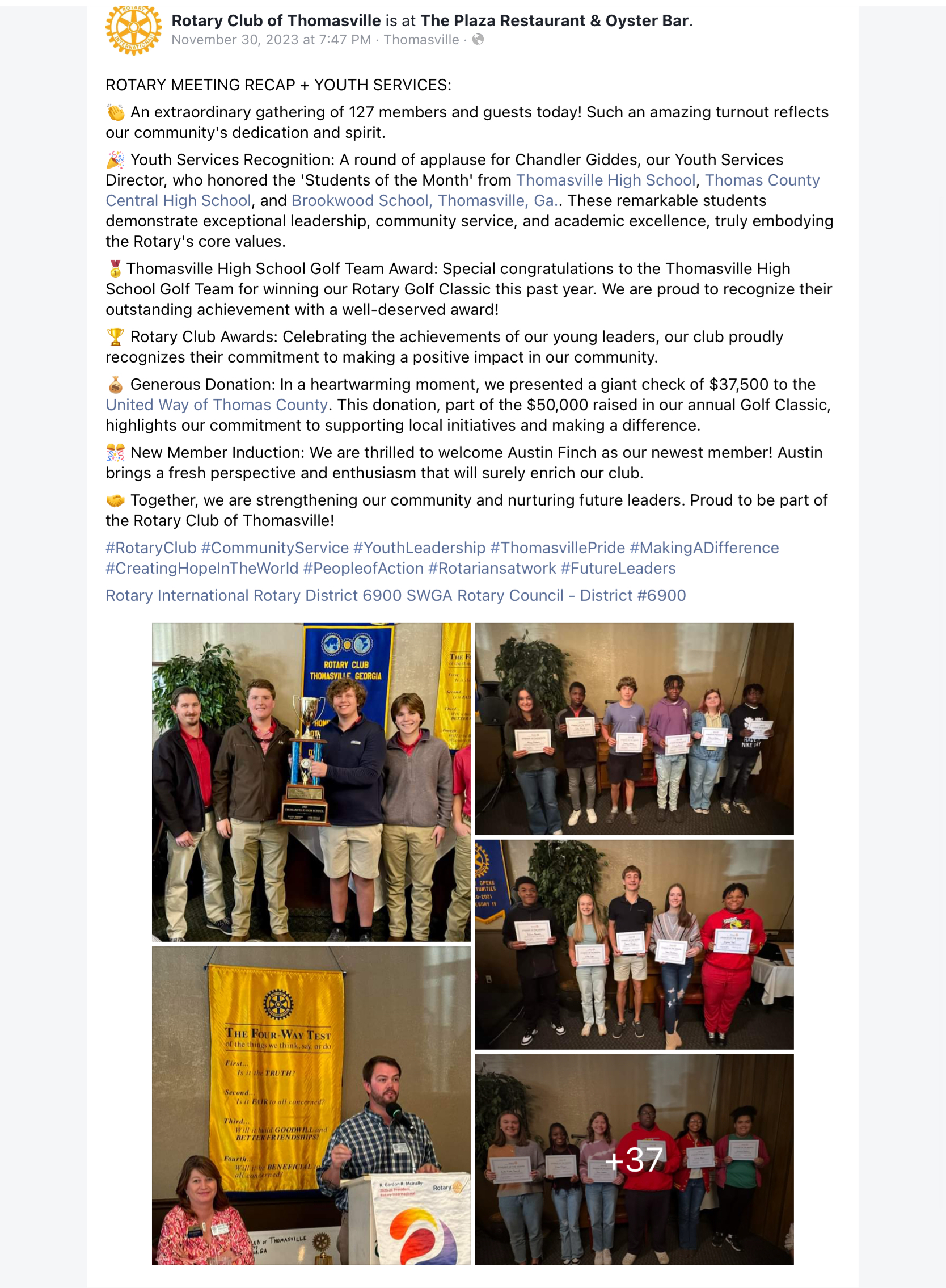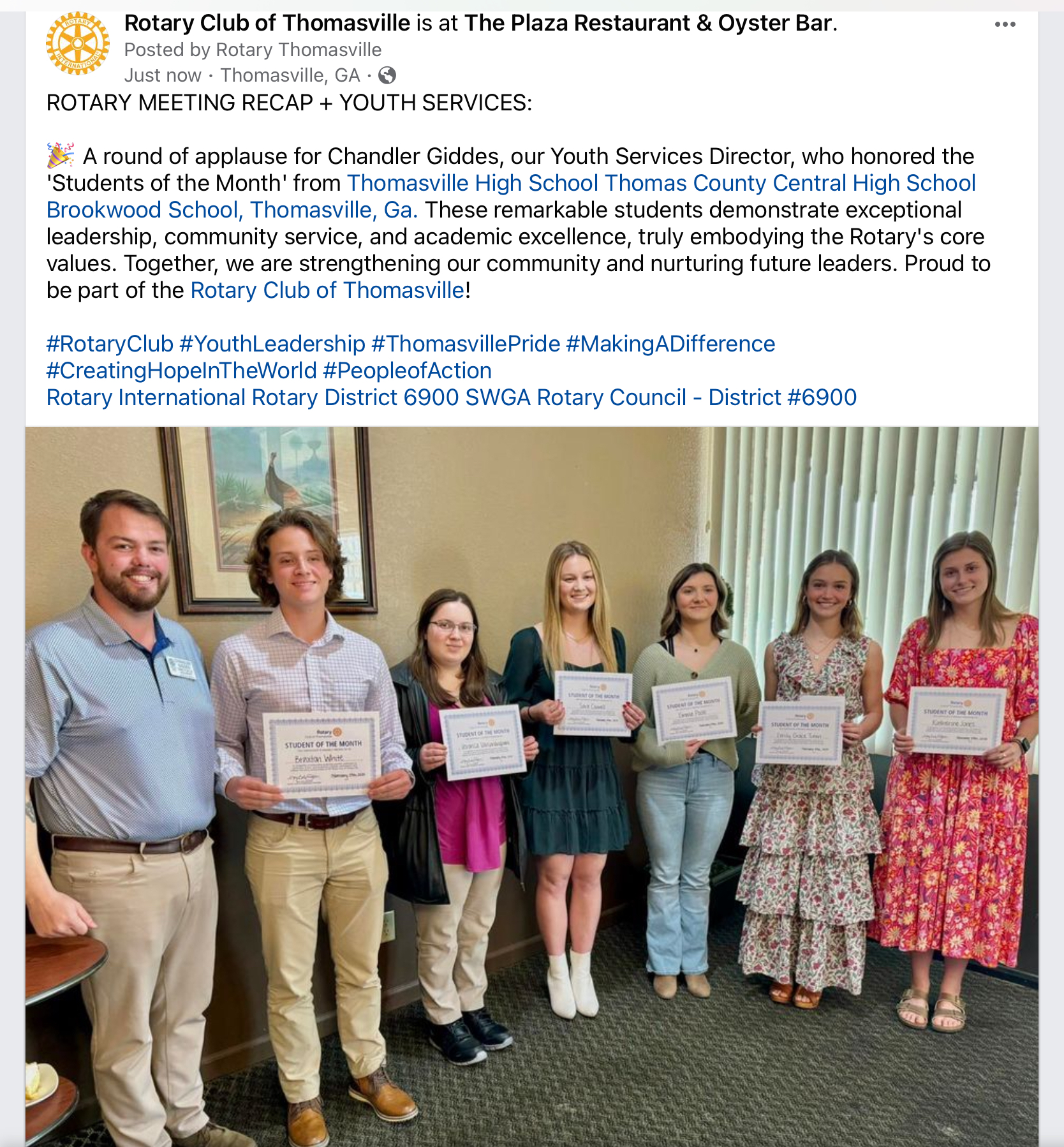 Each quarter, the Rotary Club of Thomasville in partnership with our local school systems give awards to outstanding students. We kicked this year off by hosting 35 students from the 3 school systems and continued it throughout the year by presenting 12 seniors quarterly with Certificates and a meal at the Plaza.