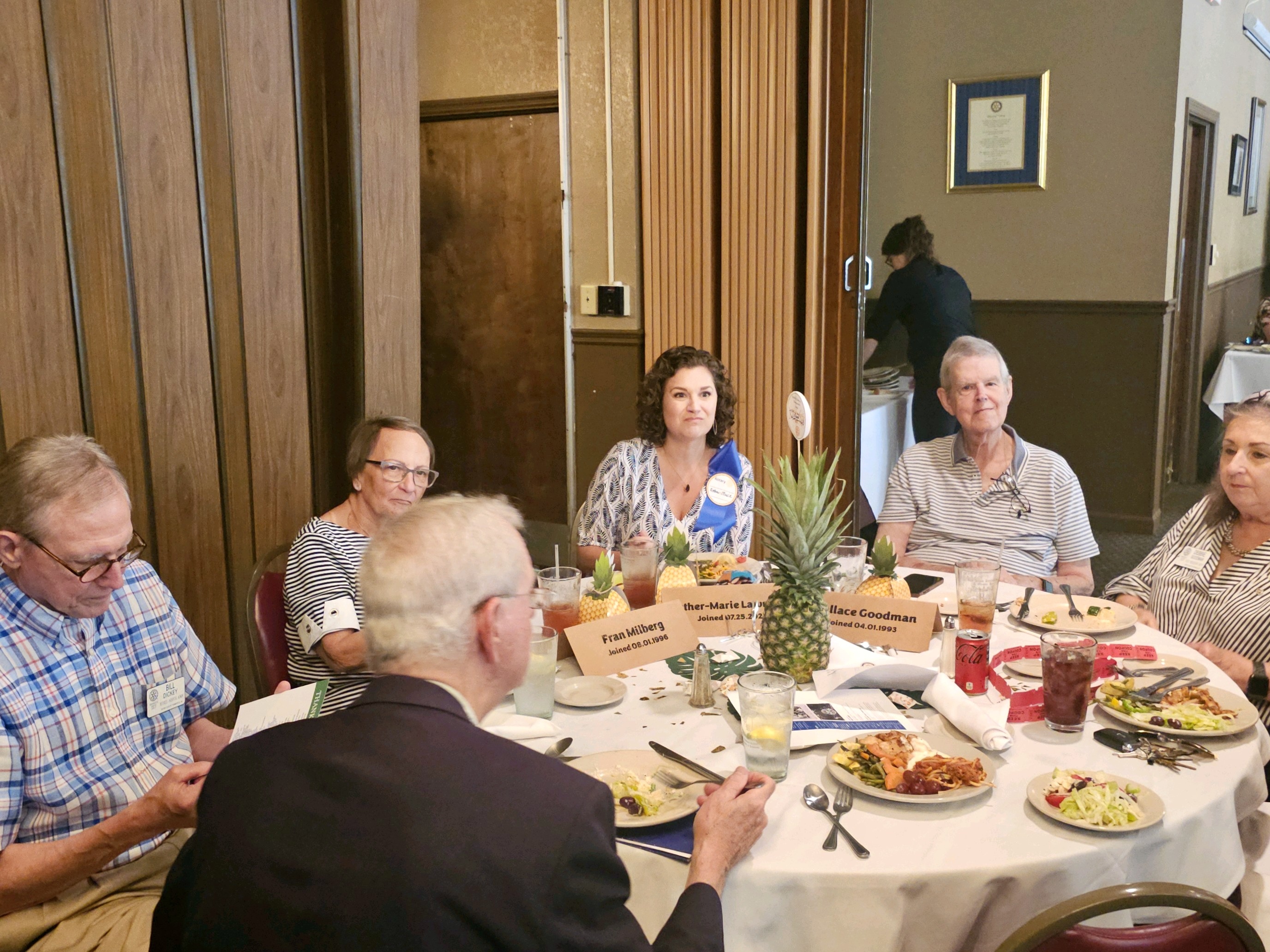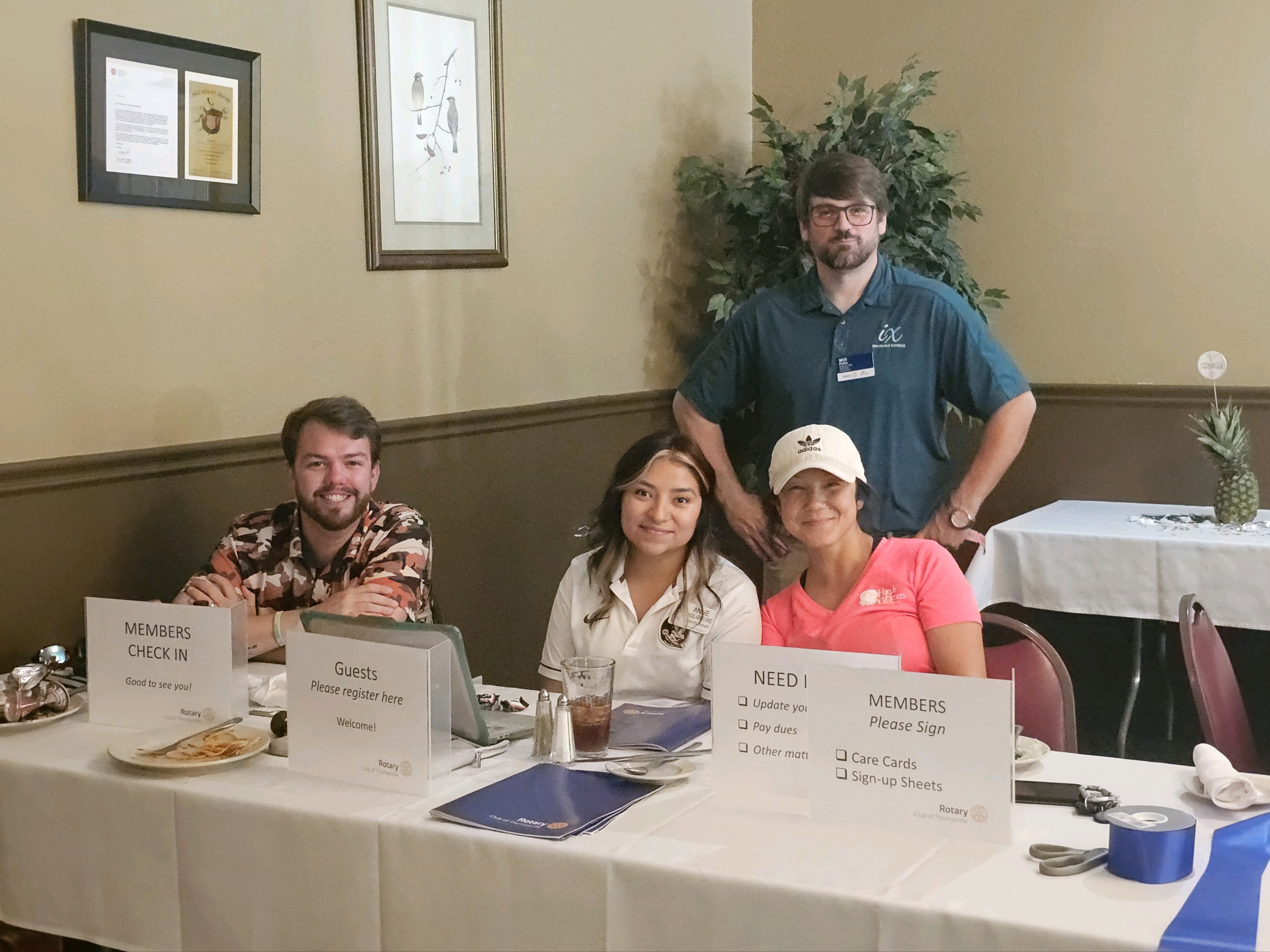 As members arrive, the "back table" team offer support for whatever may be needed, including support paying dues, updating info, making donations, signing up for projects, buying club merch, and answering any needs or questions.