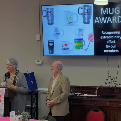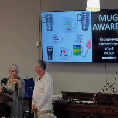President recognizing members whose efforts are extraordinary with mug awards--specific themed mugs or drink bottles--such as Auction Queen, Chaos Coordinator, Master Chef, Best Volunteer, etc.--are presented at regular meetings;